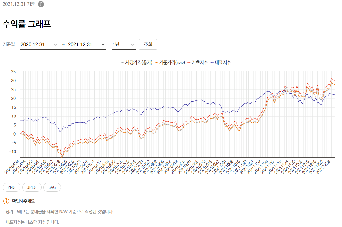 1년 수익률을 보면 파란색의 기초지수(나스닥지수)보다 높은 상승률을 보여주고 있다. 2022년에도 현재 지수보다 20%정도 더 상승할것으로 보고 있으니 그래프가 하락하고 V자로 올라갈떄 마다 매수를 추천한다.