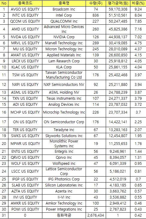 미국반도체 산업 전체를 다 넣어서 구성된 종목이다. 그림에는 삼성전자와 SK하이닉스가 있지만 구성종목에는 없다. 미래에섯 홈페이지가 사기치는건가;;