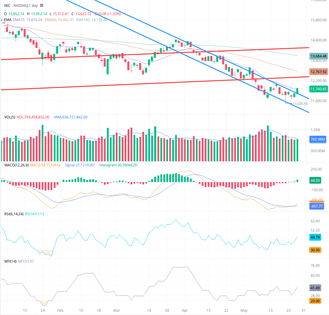 나스닥은 오랜만에 차트를 뚫고 오르는 모습을 보여주고 있습니다. 오늘 장이 중요한데 여기서 다시 하락하지 않고 횡보 또는 상승한다면 하락장에서 턴어라운드 하는 모습을 보여줄것이라고 생각됩니다.