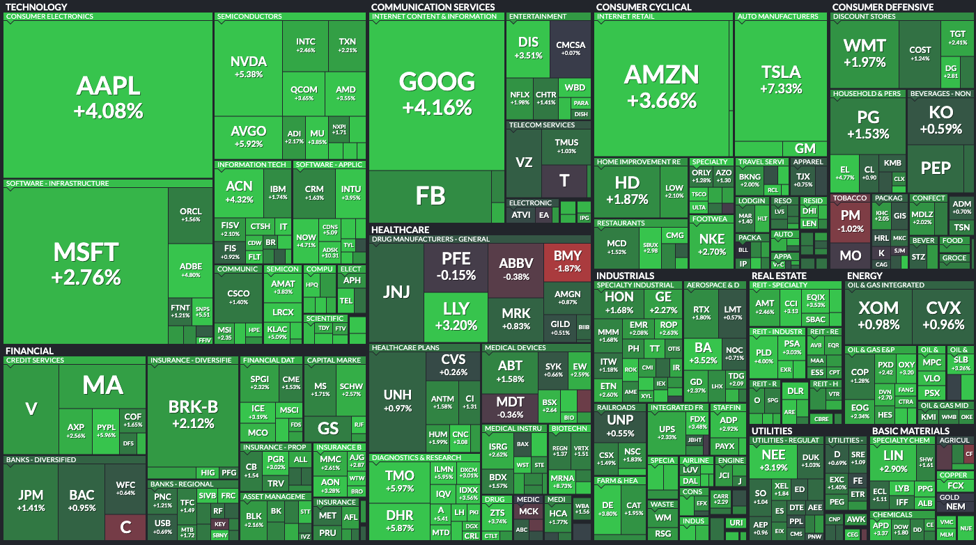 스탠더드앤드푸어스(S&P)500지수는 전장보다 100.40포인트(2.47%) 상승한 4,158.24로, 기술주 중심의 나스닥 지수는 전장보다 390.48포인트(3.33%) 오른 12,131.13으로 장을 마쳤다.