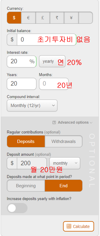 위와 같이 세팅하고 투자를 시작한다. 환율은 일단 무시하고 계산해 보자.