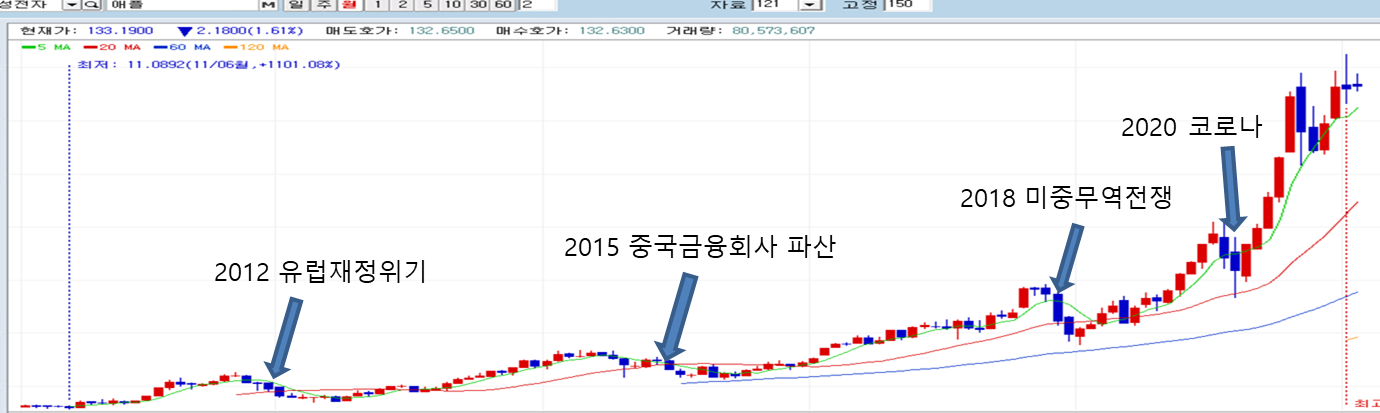 과거의 데이터가 미래를 확정 지울수는 없지만 과거의 데이터를 기반으로 미래를 예측하기 때문에 애플에 앞으로 투자하는것이 이성적으로 더 맞지 않을까 한다.