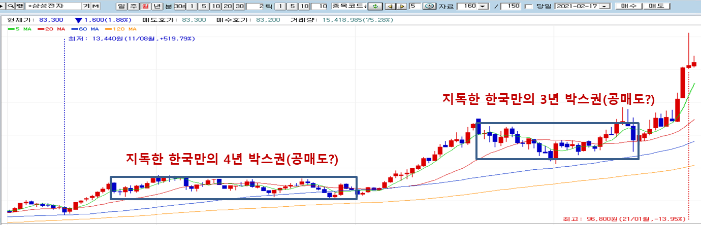 한번 주가가 오르면 오른상태에서 3~4년 박스권을 계속 형성 해서 흘러간다. 주식 투자를 하는 사람 입장에선 아직도 그대로네? 하는 옛날 비누 CF가 생각나게 하는 모습이다. 지나고 나면 올랐으니 괜찮겠지만 그사이에 진입한 개미 군단들은 80~90%이상 나가 떨어지지 않았을까 한다.