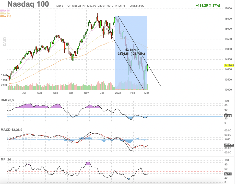 나스닥은 최대 22%까지 조정을 받았습니다. 그후 다시 올랐지만 현재로서는 부가 지표들이 상승을 보여주는 모습이 나타나고 있습니다. 이미 나스닥의 조정은 어느정도 받을 만큼 받았고 이번 파월의장 발언이 3월에 금리 0.25%정도만 올린다고 발표되어 증시가 탄력을 받았습니다. 이제 매수 시점이 다가 오고 있습니다.