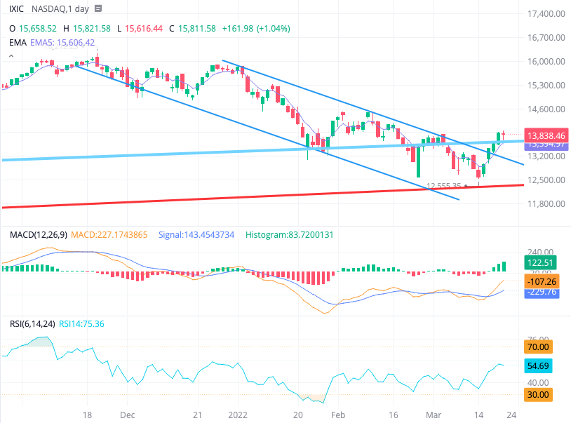 어제 이야기 했듯이 넘올라서 쉬어 가는 타이밍이라고 했는데 너무 음봉이 작게 나왔네요. 좀더 내렸으면 좋겠는데 여전히 위에 MACD와 RSI 보조지표를 보면 더 올라갈 가능성이 있습니다. 어젠 연준의장 파월아저씨가 제38회 연례 경제 정책 컨퍼런스 전미 경제 협회(National Association for Business Economics)에서 연설을 매파적 발언으로 증시가 흔들렸지만 JP모건등 이제 사도 된다는 뉴스에 저가 매수유입이 되면서 장 후반에 반등했습니다. 좀더 내리길 기대합니다.
