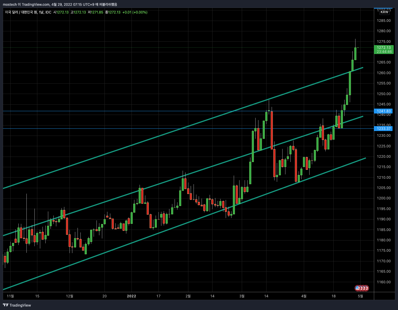 환율은 1277원까지 갔다가 현재 1272원으로 소폭 내려왔지만 여전히 환율에 대해서는 정부개입이 없으면 전망이 좋지 않습니다.