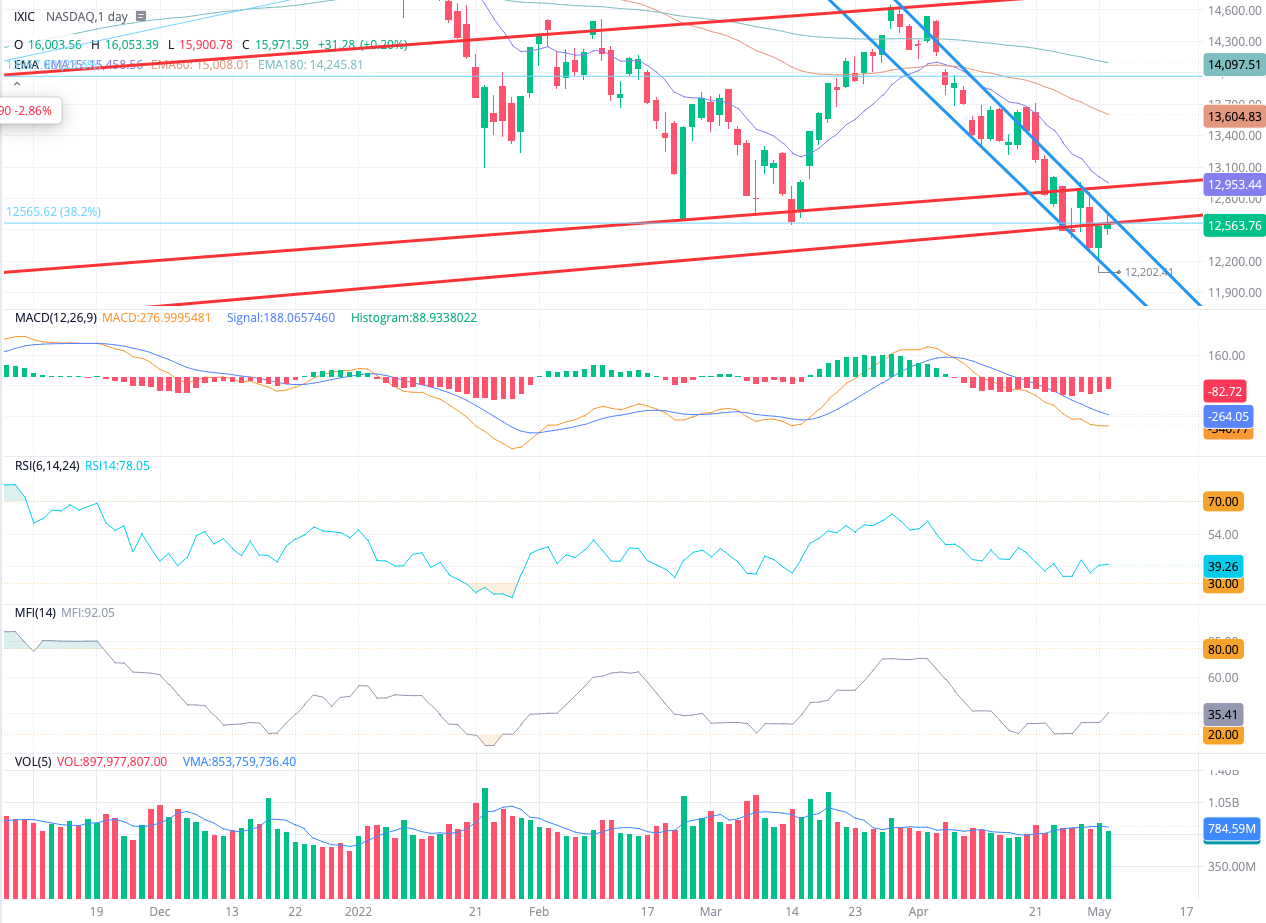 나스닥 어제는 선방했네요. 차트를 보면 하락중에 상방에 걸려서 5/5일 FOMC 발표만 기다리고 있는 모습입니다.