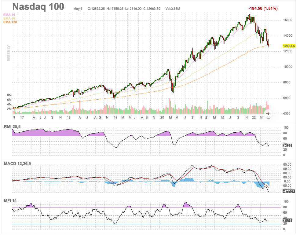 나스닥은 현재 주봉으로 EMA120선 까지 내려 왔습니다. 위의 그래프를 보시면 아시겠지만 나스닥이 주봉 EMA120일선 밑으로 내려온건 코로나나 위기떄 아니고는 없습니다.